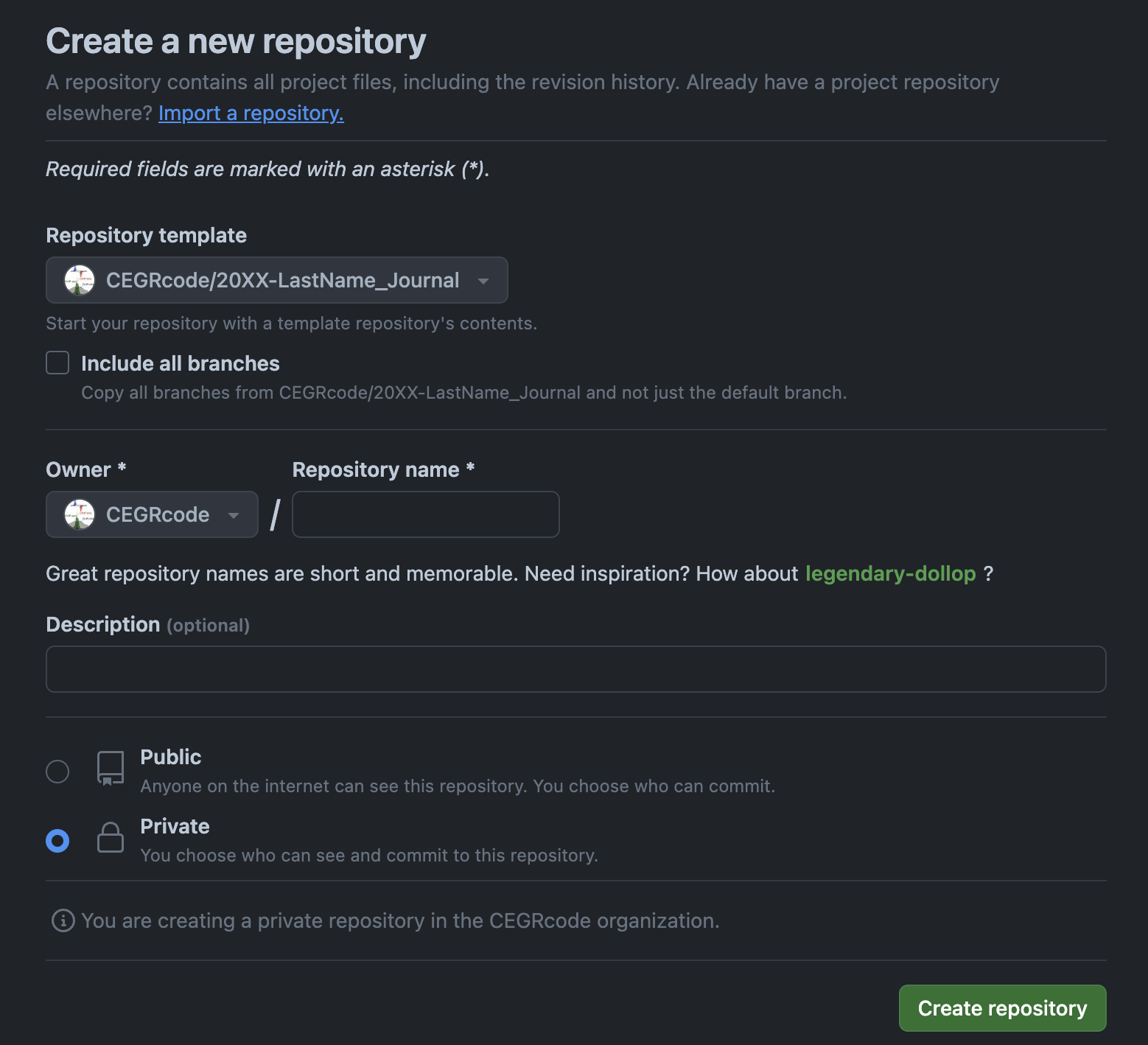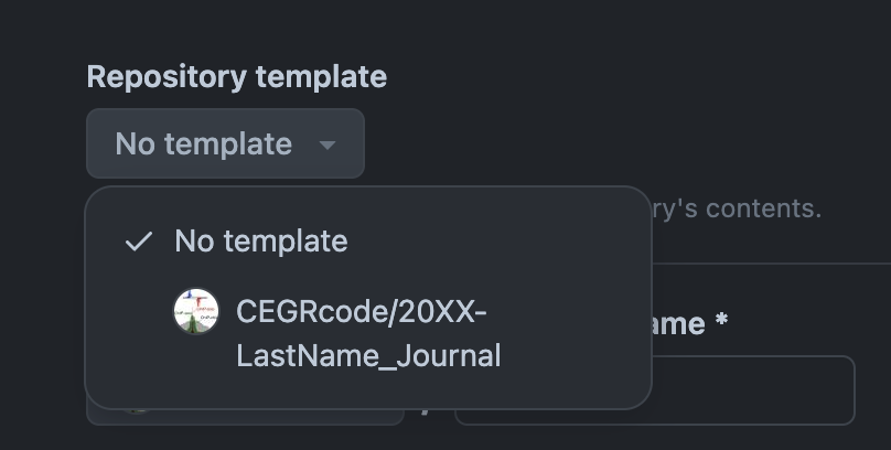 Please consider initializing a repo for your manuscript via the internet browser from the CEGRcode organization page. Navigate to the "Repositories" section and select the green "New" button. Make sure you are logged in and a member of the CEGRcode